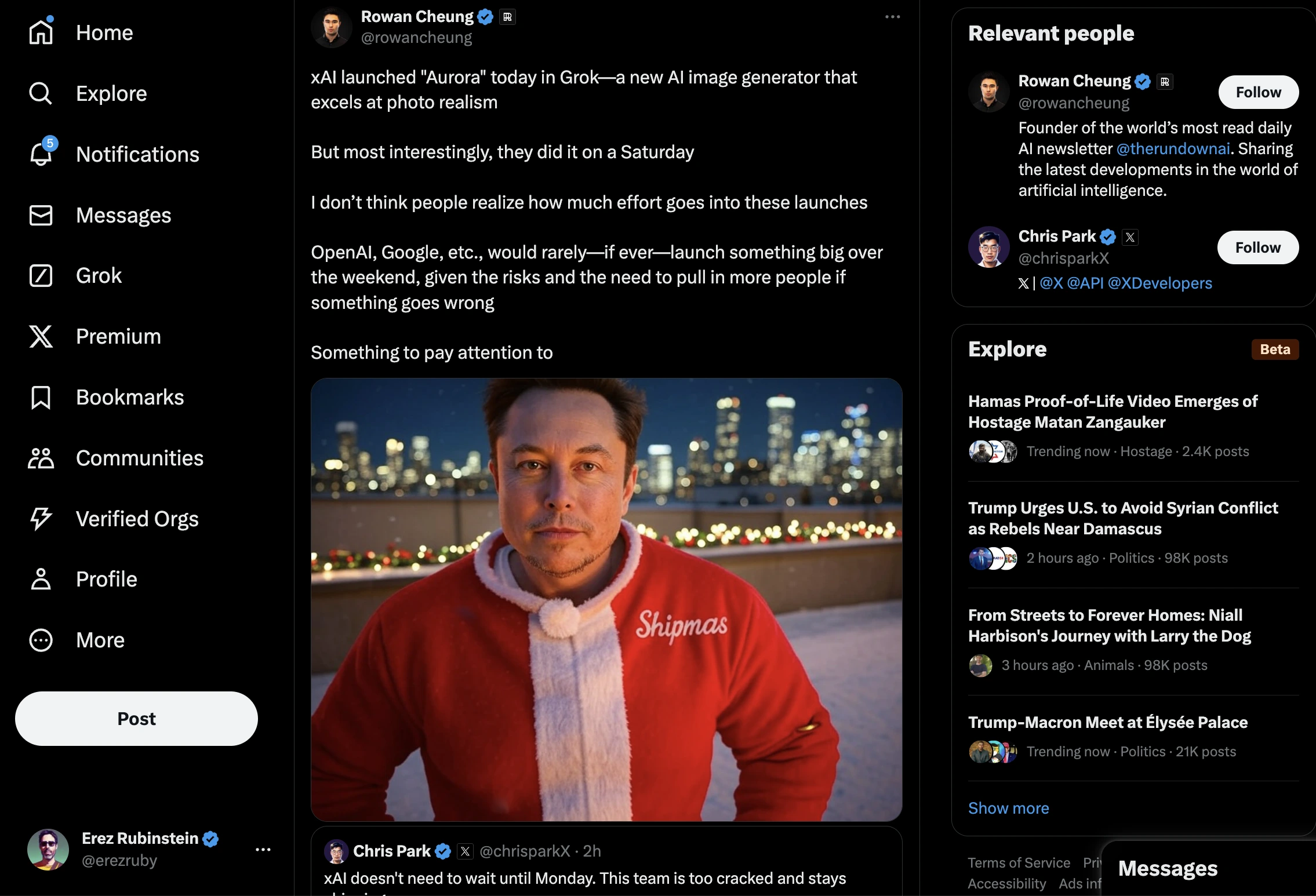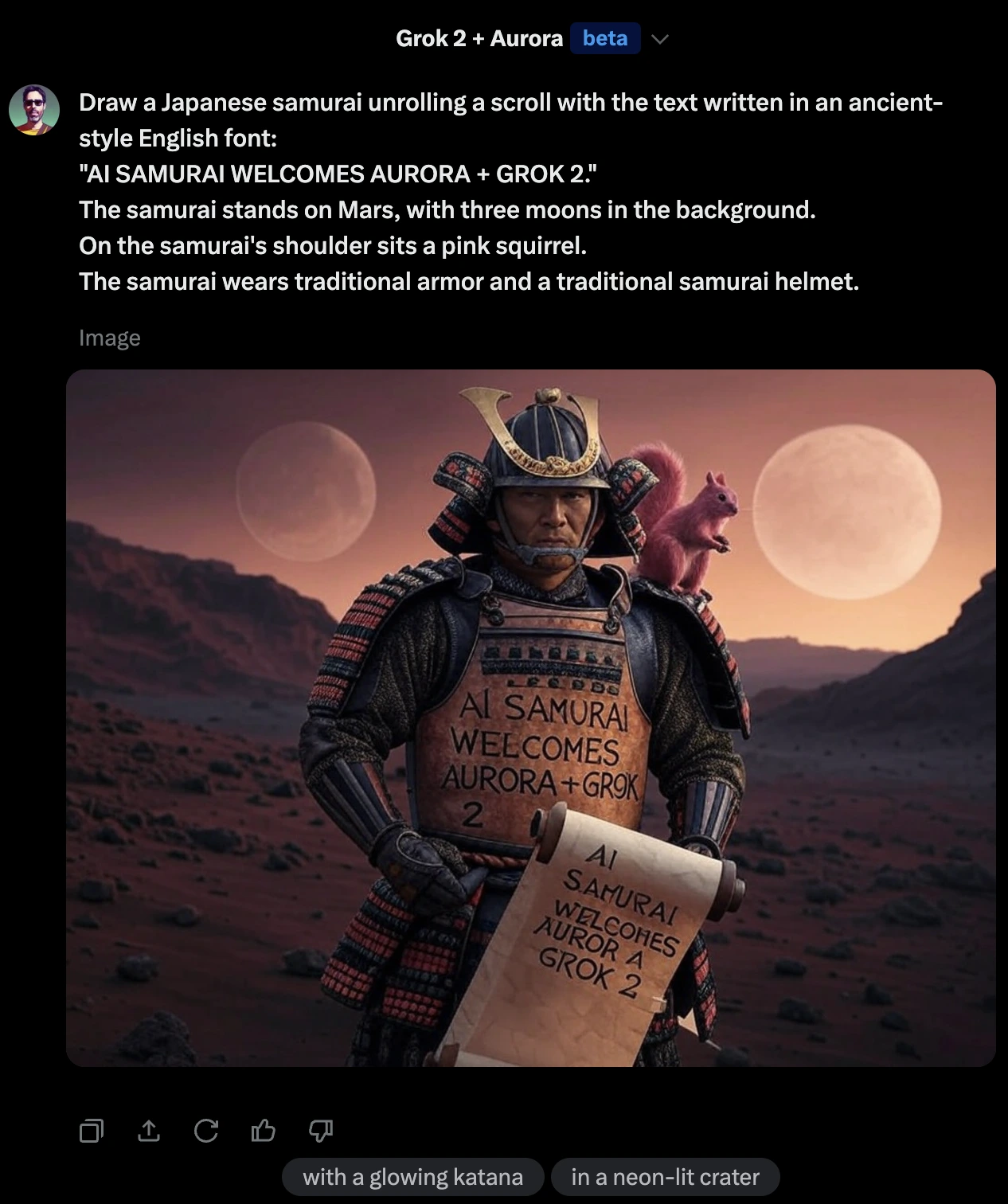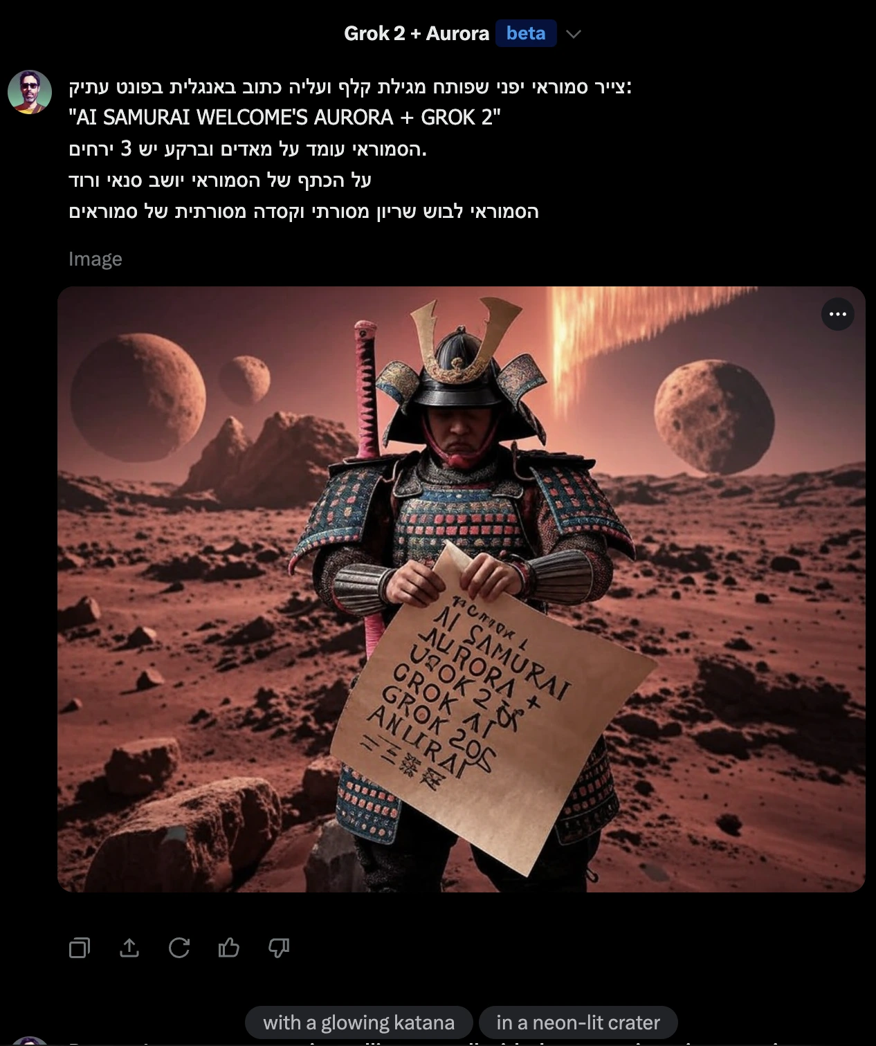 xAI, החברה של אילון מאסק בתחום הבינה המלאכותית, עושה שוב כותרות עם השקה שקטה של מודל Aurora – דגם חדש ליצירת תמונות במסגרת מערכת Grok 2 אשר פתוחה למשתמשי פרימיום של X (טוויטר לשעבר) שרכש מאסק בשנה שעברה וגם למי שאינו מנוי יש אפשרות לג׳נרט ארבע תמונות ביום. המודל מעורר עניין רב בזכות יכולתו להפיק דימויים מציאותיים באופן יוצא דופן, עד כדי כך שמשתמשים מדווחים על תמונות של דמויות מפורסמות שנראות כמעט זהות לצילומים אמיתיים. באופן מפתיע, ההשקה, על אף שהיא די שקטה, מבוצעת ביום שבת. זה לא יום של השקות, כי אם יש תקלות, צריך צוות מלא בהיכון לתיקונים בזמן אמת. מהתנהוגות דומה בעבר, לא אופתע אם מאסק הביא את כל הצוות למשרד ביום שבת.